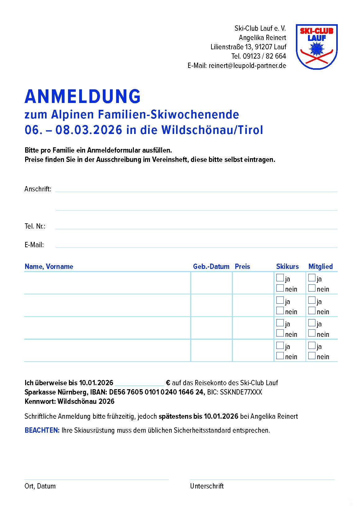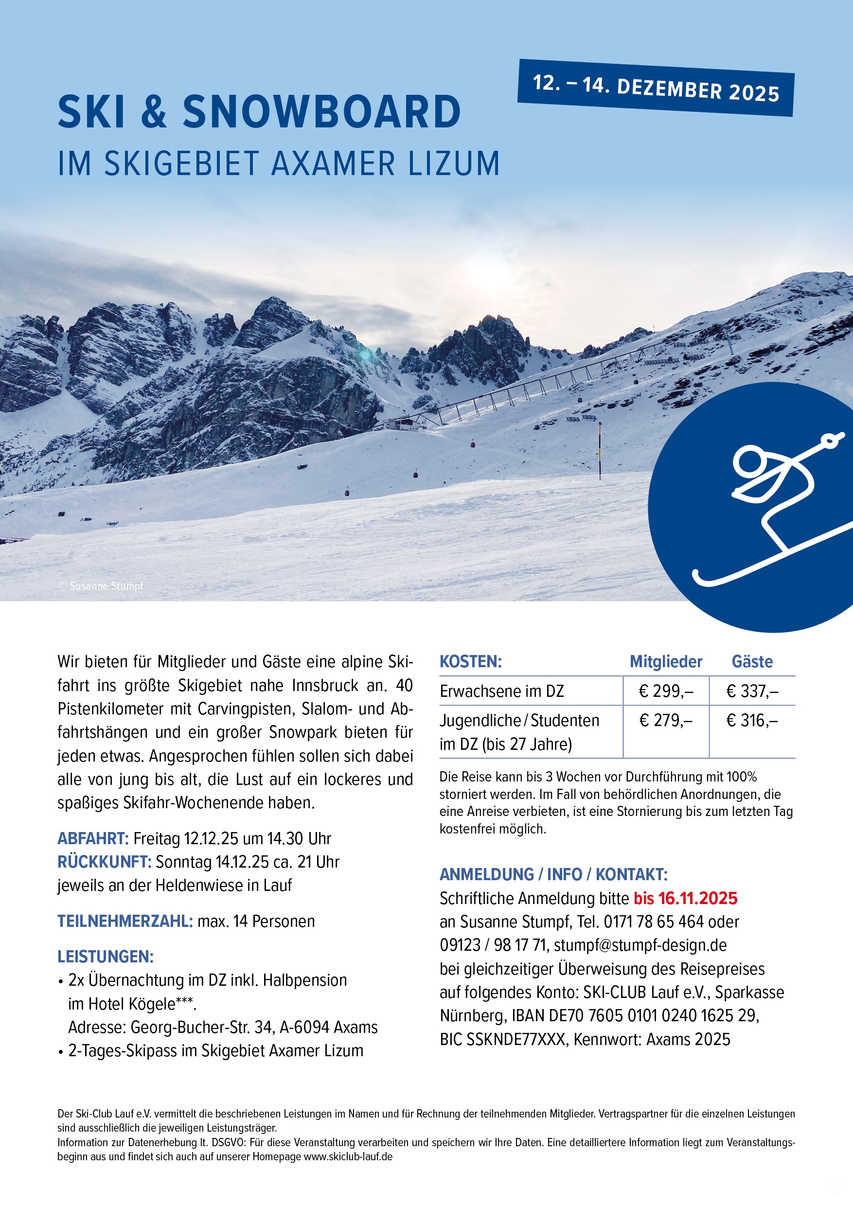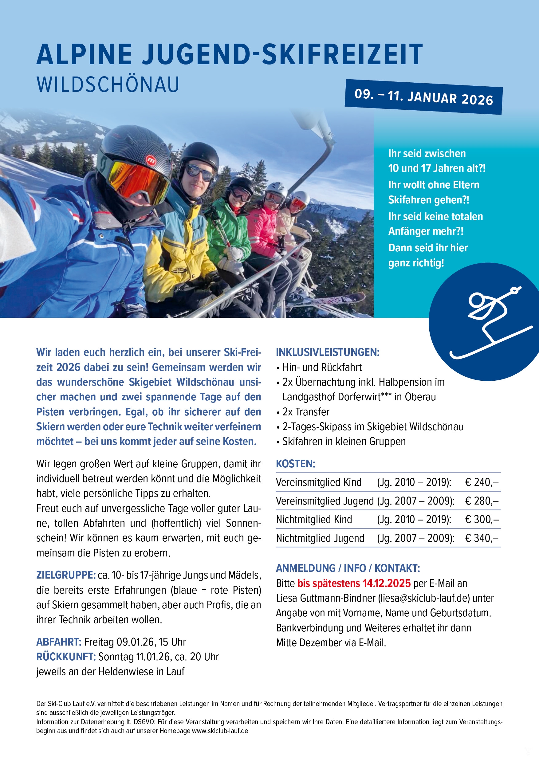 Anmeldung bis spätestens 14.12.2025 per E-Mail an Liesa Guttmann-Bindner, liesa@skiclub-lauf.de, mit Vorname, Name, Geburtsdatum.